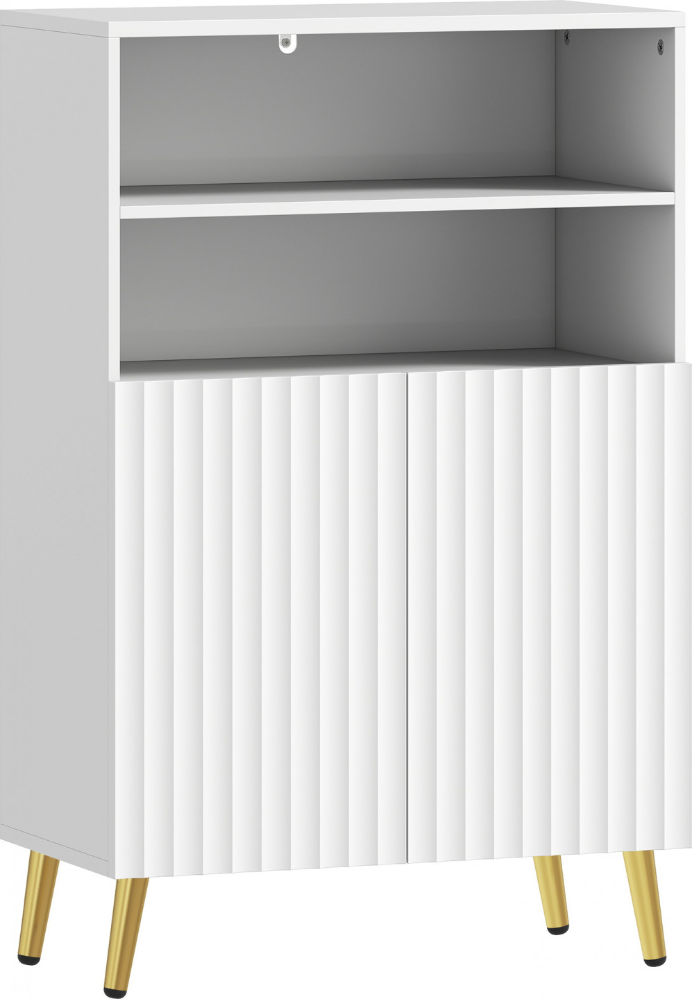 - Křídlová dvířka, celobílý povrch a zúžené nožky ve zlaté barvě pro moderní, elegantní vzhled.