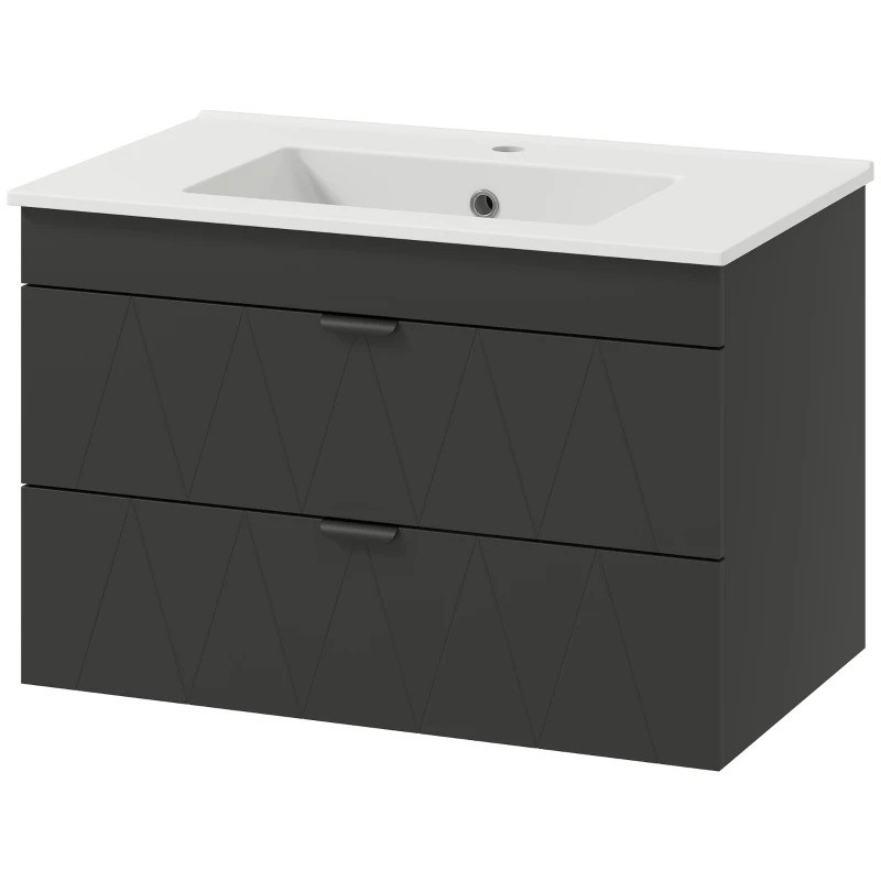 Proměňte svou koupelnu v elegantní útočiště díky závěsnému umyvadlu. Matně černá povrchová úprava a keramická skříňka nabízejí moderní eleganci, zatímco závěsné provedení šetří místo - ideální pro menší obytné prostory. Dvě velké zásuvky v koupelnové skříňce udržují pořádek a organizovanost. Užijte si pohodlí bez námahy a styl, který díky snadnému přístupu a propracované estetice obohatí vaše každodenní rutiny.
