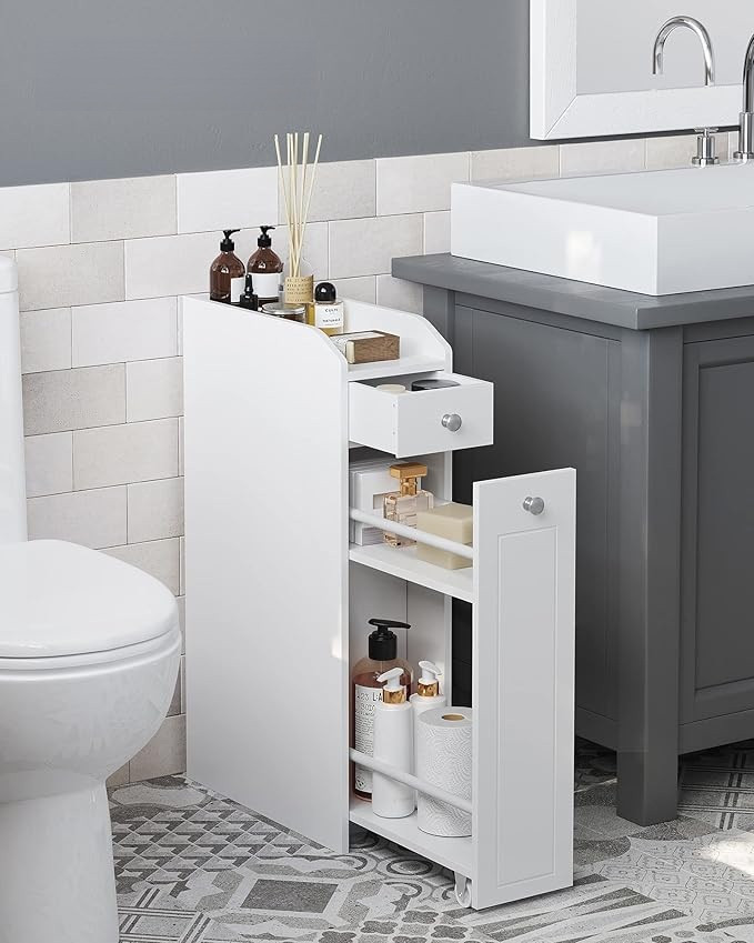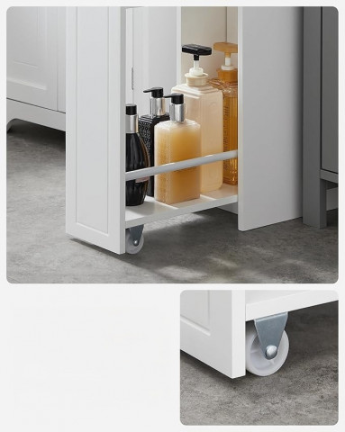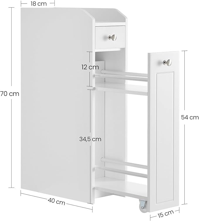 Tato koupelnová skříňka 40 x 18 x 70 cm je vhodná do malých koupelen a snadno se přemisťuje. Díky čistým liniím a zářivě bílé nabízí nejen úložný prostor, ale dodá vaší koupelně více stylu