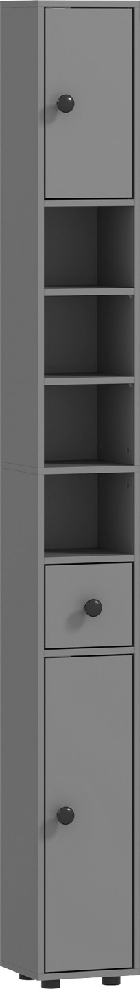 Skříňka je ideální pro malé koupelny, které vyžadují efektivní úložný prostor. Díky rozměrům 20 x 20 x 180 cm, horní a spodní skříňce, zásuvce a čtyřem otevřeným policím nabízí dostatek prostoru pro vaše koupelnové předměty. Robustní konstrukce z dřevotřísky s melaminovým povrchem snadno ochrání před každodenním opotřebením. Její čistý, šedý design poskytuje moderní a přizpůsobivý vzhled.