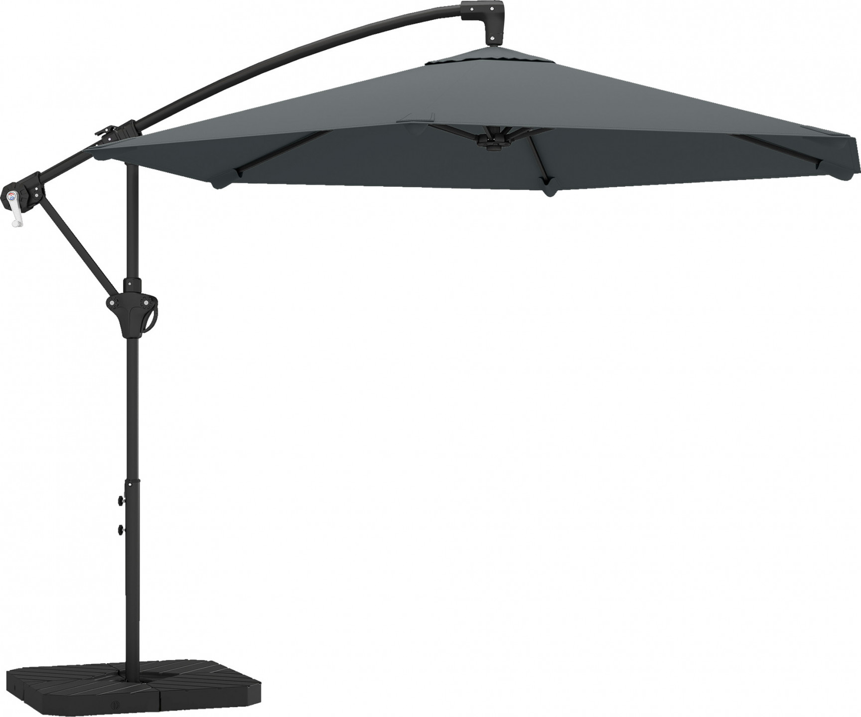 Užijte si příjemný stín se slunečníkem cca 3 m offset market. Větraný polyesterový potah a robustní kovový rám zajišťují bezpečné držení ve větrném počasí, zatímco zesílené otočné rameno poskytuje dodatečnou stabilitu. Díky křížové základně a čtyřem plnitelným závažím má slunečník vše potřebné pro snadnou montáž. Ochrana UPF 30+ zajišťuje pohodlnou oázu ve stínu na zahradě.