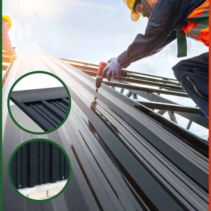 14 pozinkovaných střešních panelů má výšku 110 cm a šířku 46 cm . Výsledkem je plocha 7 m² . Celkovou velikost můžete upravit podle svých potřeb. Tloušťka plechů je 0,25 mm .