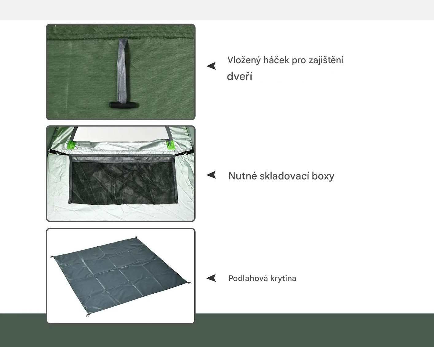 - Pevné a flexibilní ocelové tyče v pop-up provedení pro okamžité sestavení, které udrží rám ve vzpřímené poloze