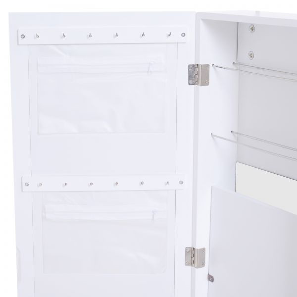 Tato šperkovnice s jednoduchým a elegantním designem je atraktivní dekorací k zavěšení na stěnu nebo na dveře. Má sedm přihrádek a poskytuje prostor pro vaše šperky a další drobnosti, aby byly přehledné a po ruce. Mnoho malých háčků uvnitř této skříňky je určeno pro zavěšení drobností jako jsou klíče, náušnice, a náhrdelníky. Zrcadlo na přední straně této skříňky výrazně zvyšuje jeho univerzálnost a úchyt usnadňuje otevírání a zavírání skříňky. Tato skříňka je vyrobena z masivního lakovaného dřeva, což zajišťuje jeho odolnost, takže vám bude sloužit po mnoho let. Skříňka je vybavena dvěma dlouhými háčky, takže může být stabilně zavěšena na stěnu nebo dveře. Montáž je velmi jednoduchá.