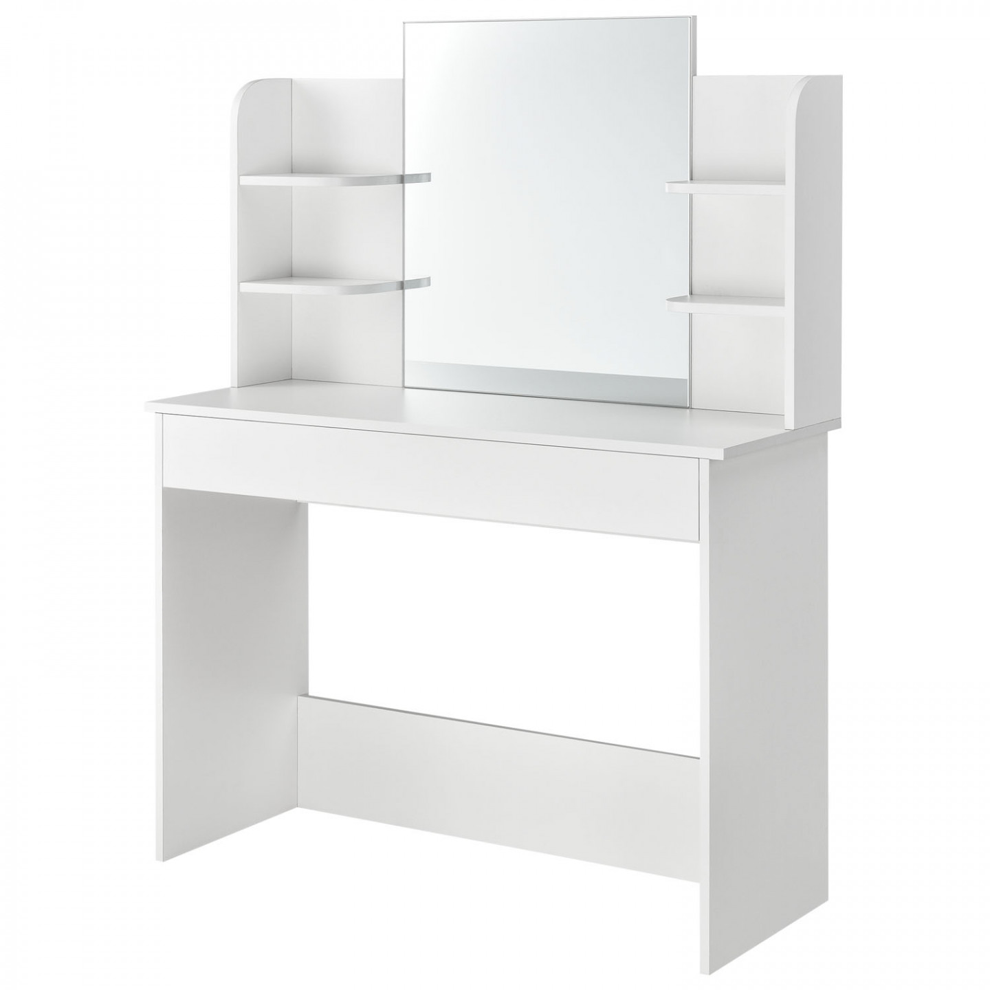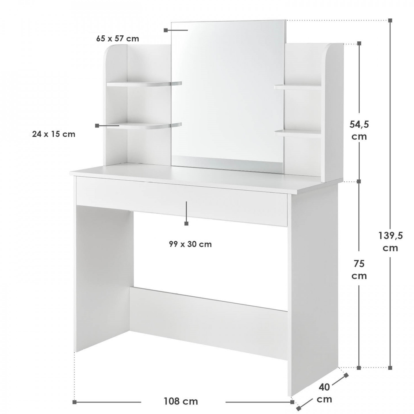 Praktické a originální doplnění interiéru každé ložnice. Vytvořte si místo pro Váš každodenní zkrášlovací rituál! Díky tomuto pohádkovému toaletnímu stolku se budete cítit jako princezna nebo rovnou královna. Najděte všem svým kosmetickým vychytávkám, parfémům, hřebenům a šperkům nový domov v tomto nádherném stolku. Získejte ve svých věcech přehled a pořádek a zejména místo, které bude patřit pouze Vám! Protože každá dáma potřebuje chvilku pro sebe. Už žádné dělení se o místo v koupelně s dalšími členy domácnosti - v praktickém toaletním stolku najdete skvělého pomocníka s úložným prostorem a zrcadlem. Vyroben z pevných MDF desek a potažen bílým lakem. Díky laku jsou povrchy odolné proti poškrábání a snadno se o ně pečuje. Prach, zbytky make-upu a jiné nečistoty lze snadno setřít vlhkým hadříkem.
