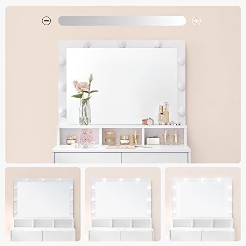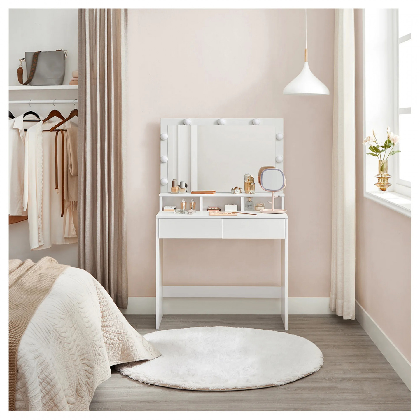 Devět žárovek tohoto toaletního stolku kolem zrcadla rozzáří Váš obličej. 2 velké zásuvky a 3 otevřené přihrádky toaletního stolku poskytují dostatek místa pro váš make-up a usnadňují organizaci vaší kosmetiky.