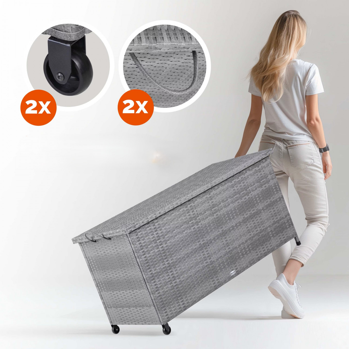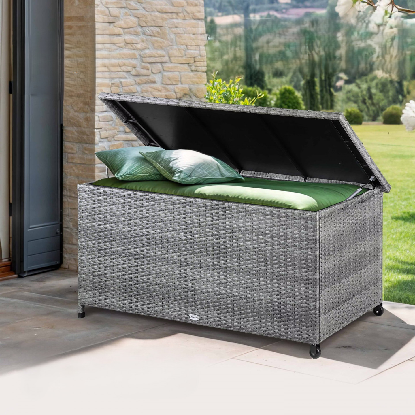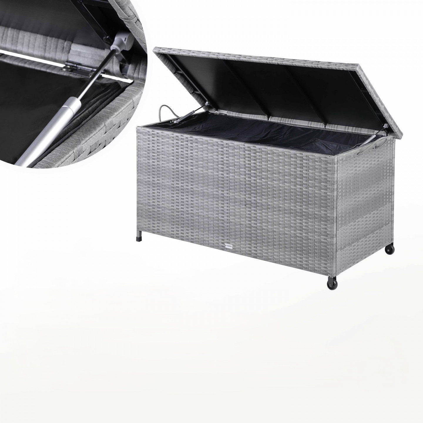 Robustní box na polštáře vyrobený ze snadno udržovatelného polyratanu nabízí dostatek prostoru pro sedáky, polštáře a další zahradní doplňky. Víko boxu poskytuje dodatečnou stabilitu. Je vyztuženo polykarbonátovými vícevrstvými panely a snadno se otevírá a zavírá díky automatickému zvedáku se dvěma plynovými pružinami. Okapní lišta po obvodu navíc umožňuje odkapávání dešťové vody a brání tak jejímu pronikání do zahradního boxu otvorem. Dvě kolečka a dvě rukojeti usnadňují přepravu úložného boxu. Chcete bezpečně uskladnit své polštáře a podušky? Naše zahradní truhla nabízí optimální ochranu před vlhkostí a hmyzem. Polyesterová podšívka je vodotěsná a je připevněna k vnitřní straně zahradní truhly suchým zipem. Další výhoda: Podšívku lze také otevírat a zavírat zipem. Polyratan je velmi stabilní, rovnoměrně navinuté syntetické vlákno speciálně vyvinuté pro zahradní nábytek. Je odolné vůči povětrnostním vlivům, UV záření, nečistotám a snadno se čistí.