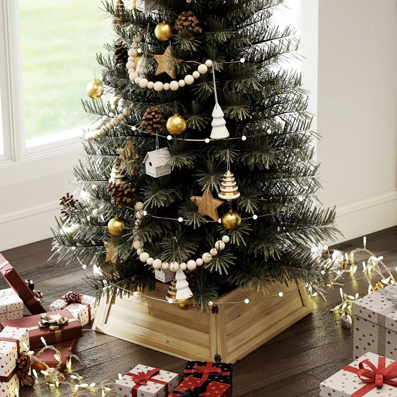 Dodejte svým svátečním dekoracím rustikální kouzlo s vánočním krytem na stromeček vyrobeným z masivního smrkového dřeva a s povrchovou úpravou. Tento kryt na vánoční stromeček nabízí nejen útulný venkovský styl, ale také elegantně zakrývá stojan na stromeček a chrání před zvědavými domácími mazlíčky a dětmi, čímž dodá vašim svátečním oslavám styl a klid.
