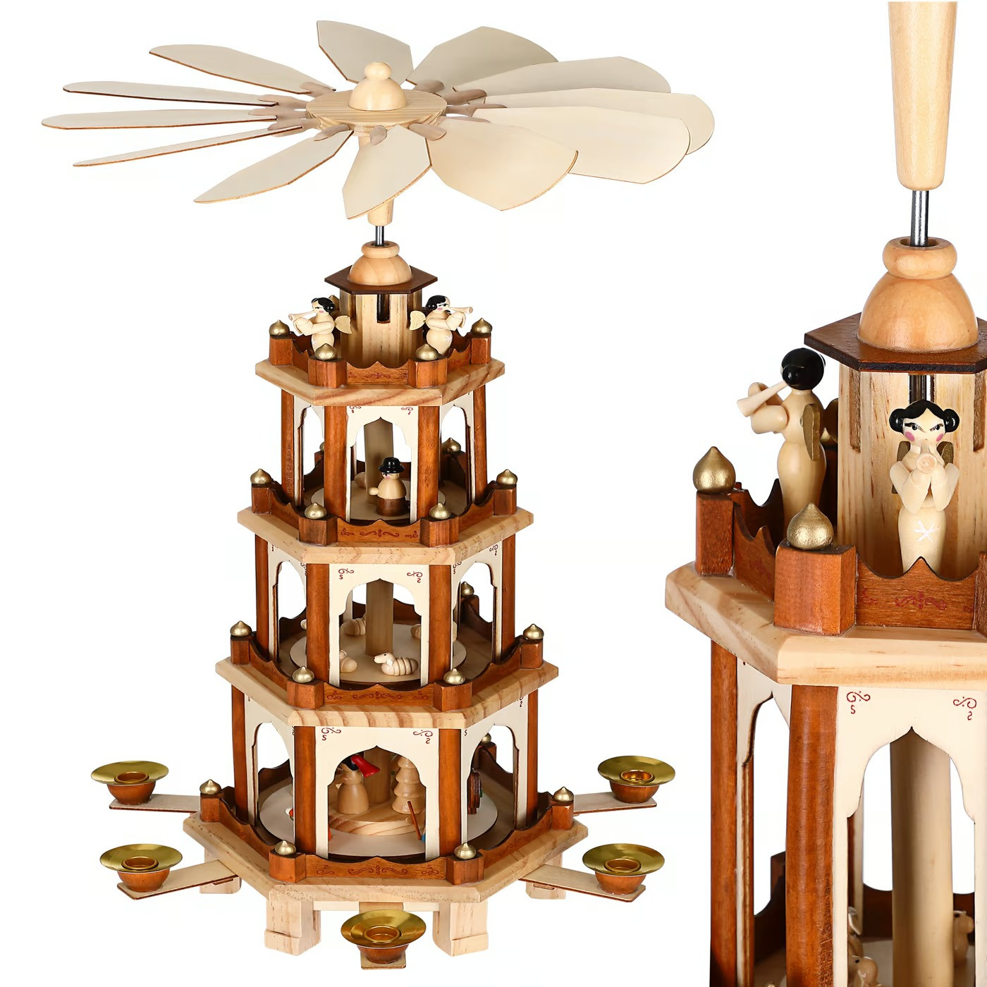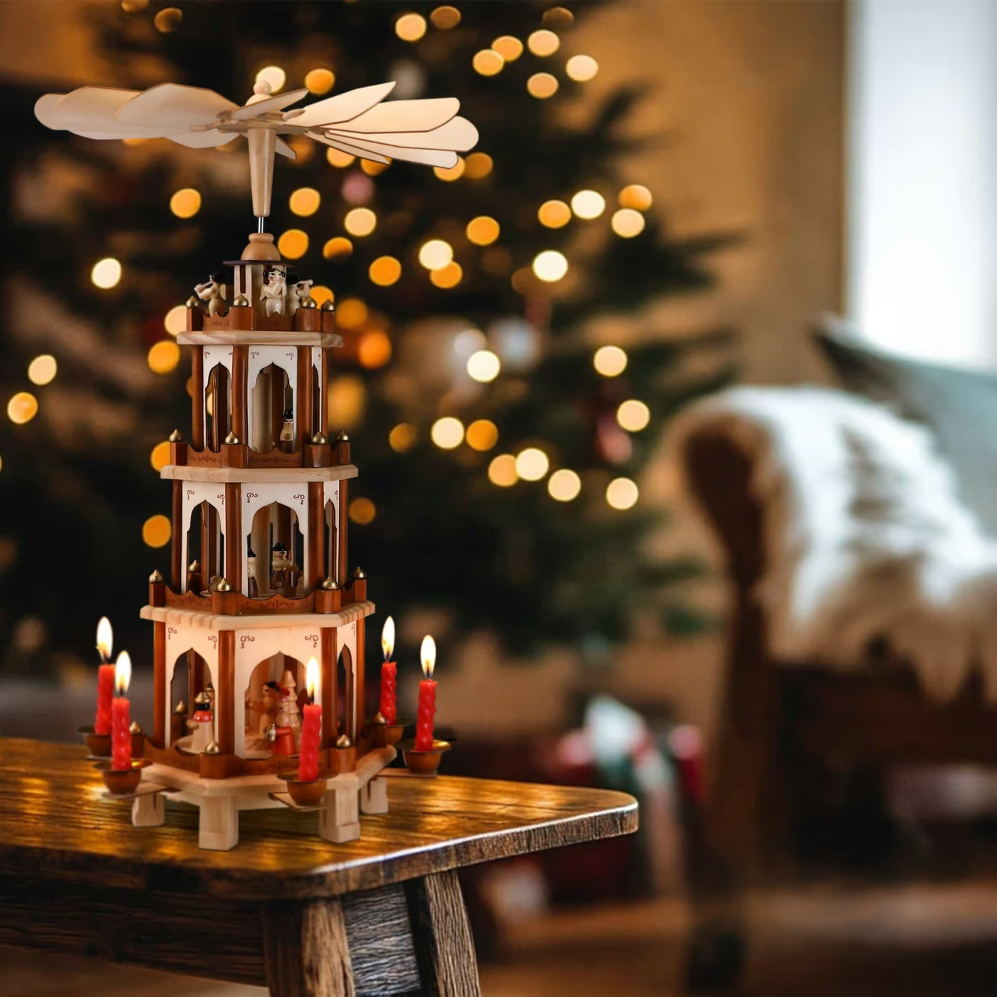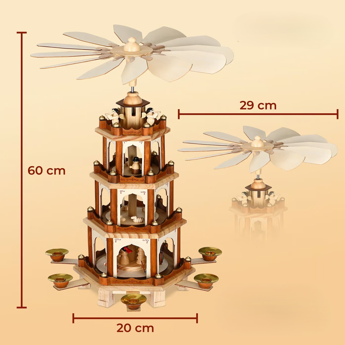 Vánoční pyramida XL 60×20×20 cm přinese do vašeho domova tradiční sváteční atmosféru. Elegantní dřevěný design a pohyblivé figurky rozzáří každý koutek a vytvoří kouzelnou vánoční dekoraci. Ideální pro stůl, komodu nebo parapet.