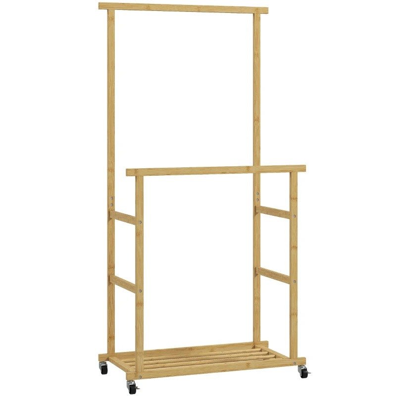 Objevte věšák na oděvy na kolečkách: Elegantní design 3 v 1 se dvěma tyčemi na oblečení a velkým botníkem pod nimi. Bez námahy se pohybuje na hladkých kolečkách a snadno se upevňuje na místě. Věšák je vyroben z elegantního bambusu a jako stylové řešení šetřící místo obohatí každou místnost.