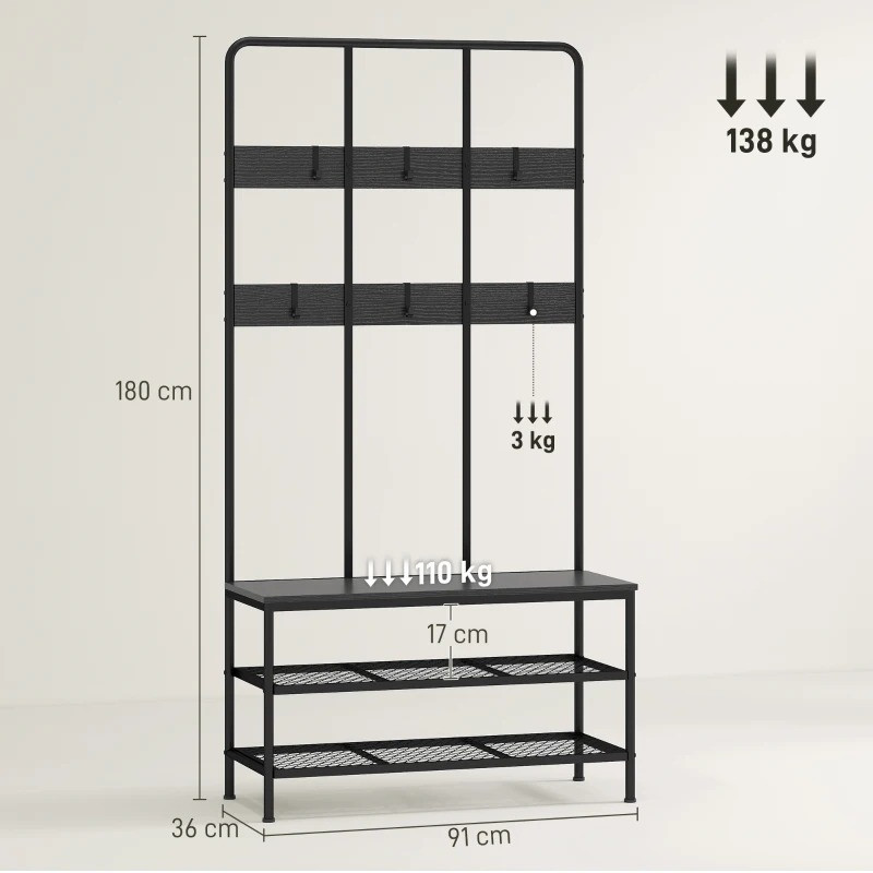 S tímto předsíňovým stromem 3 v 1 se věšák na oblečení stane hračkou. Po dlouhém dni v práci si pověste kabát a tašku na robustní dvojité háčky a posaďte se na pohodlnou lavici, abyste si mohli v klidu vyzout boty. Dvě odvětrávané síťované police pod sedákem zajistí, že vaše boty zůstanou čisté a uklizené. Díky tomuto multifunkčnímu stojanu na kabáty bude váš vstupní prostor přehledný a příjemný.