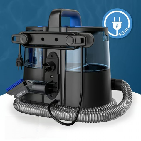 Čistič má dosah 5,5 m a váží 3,5 kg, což ho činí obzvláště všestranným. Ať už se jedná o lokální nečistoty, větší plochy, štěrbiny, koberce nebo zvířecí chlupy – díky funkcím rozprašování a sání a příslušenství je vše vyčištěno až do pórů.