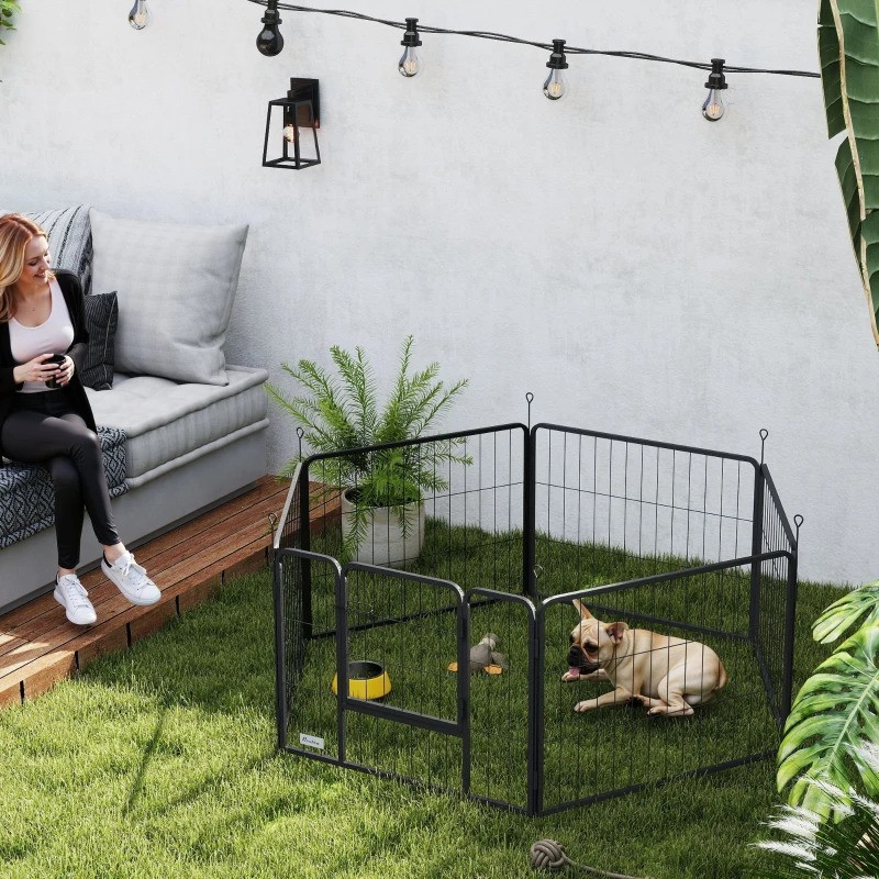Díky šesti přizpůsobitelným panelům se hrací plocha transformuje do tvarů, jako je obdélník nebo L, aby vyhovovala vašemu prostoru a potřebám vašeho mazlíčka. Bezpečná a prostorná bouda s praktickými dvířky je vhodná pro vnitřní i venkovní použití. Lze ji také snadno složit a uskladnit. Ideální pro štěňata a malé psy!