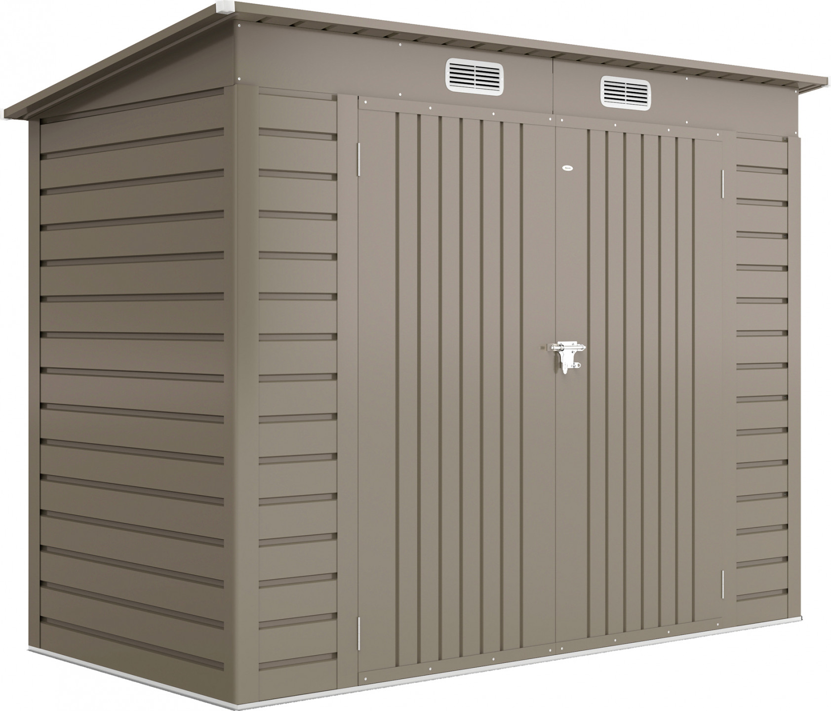 - Dvojité dveře kovového zahradního domku pro snadný přístup a závora pro dodatečné zabezpečení.