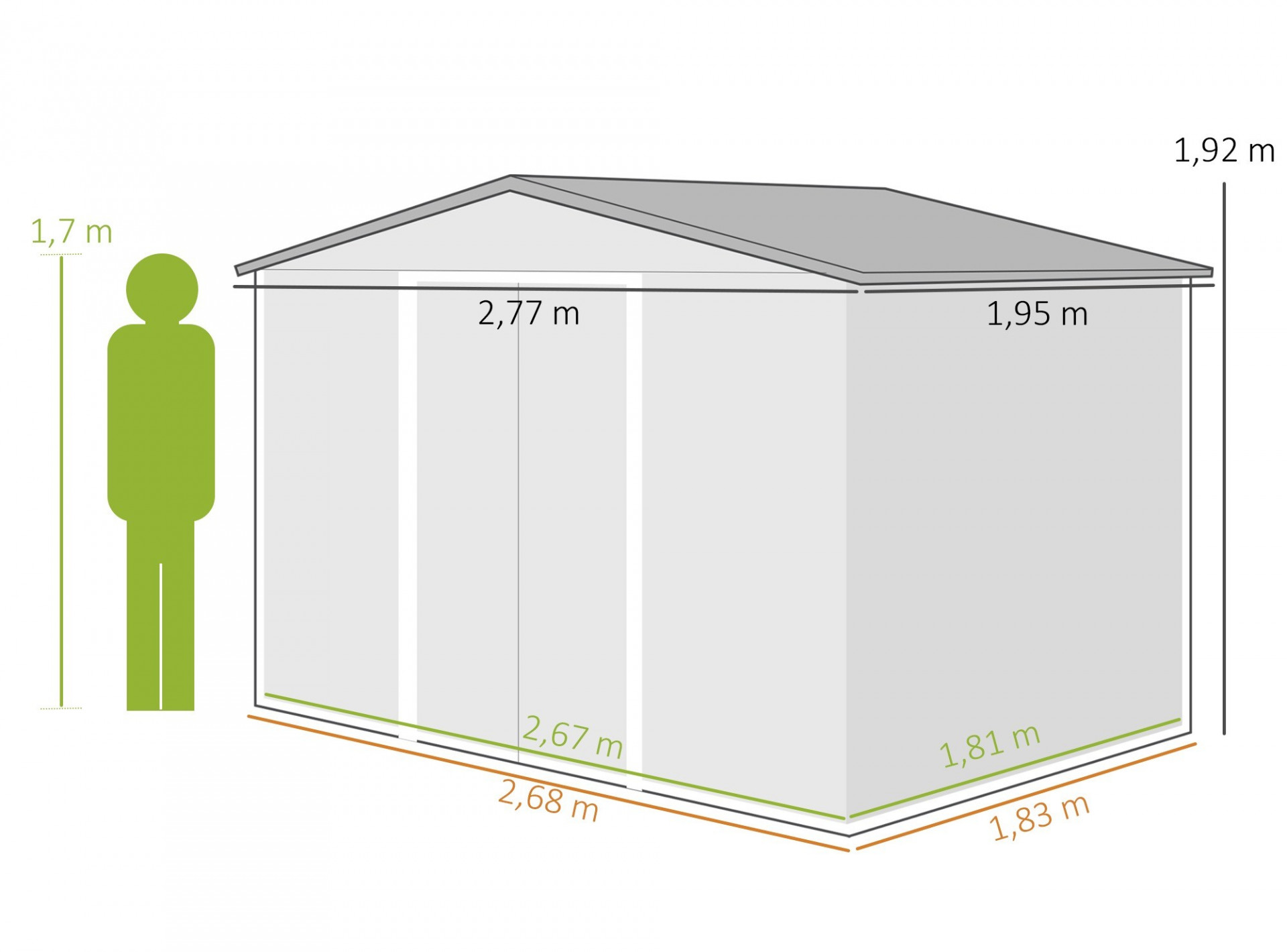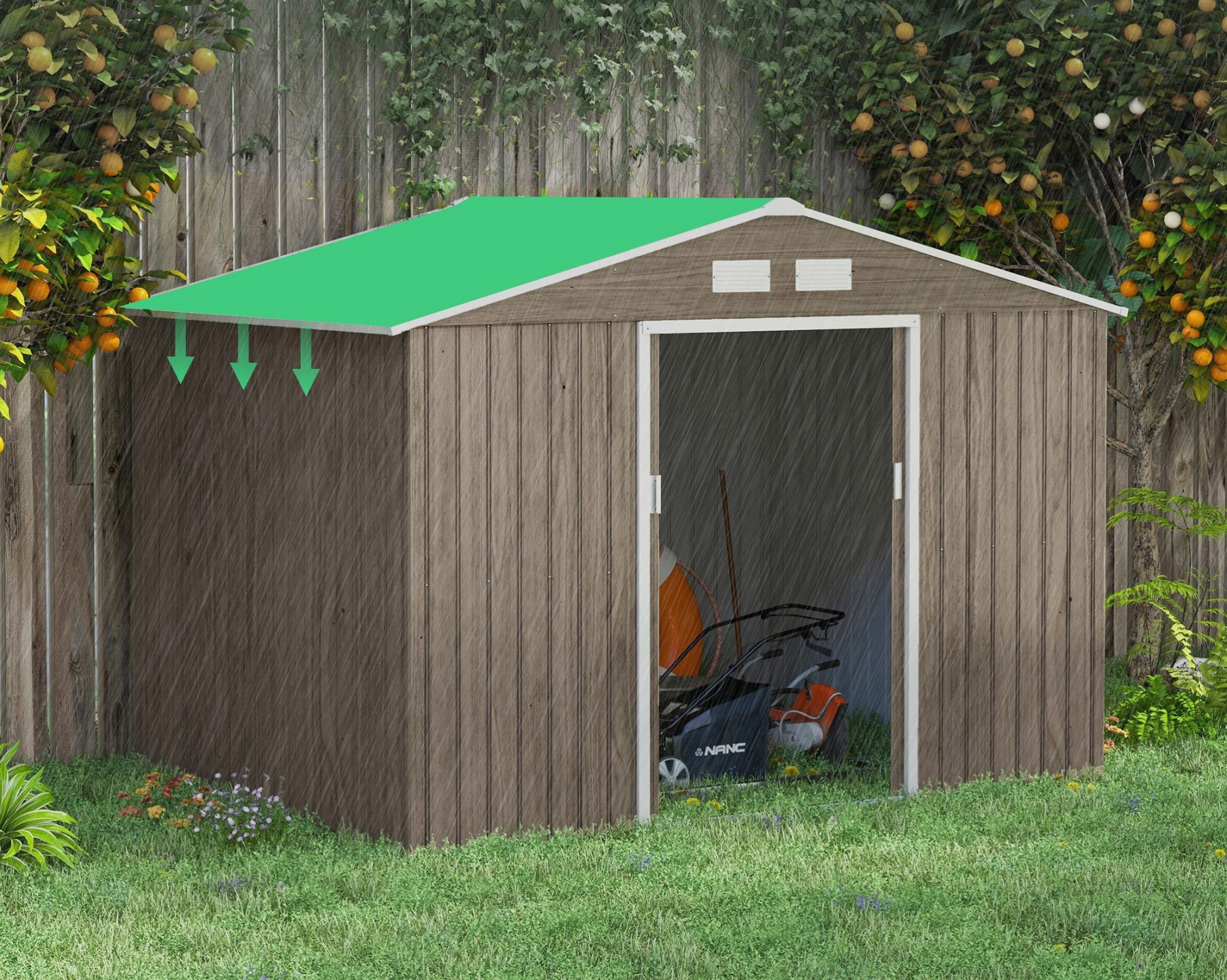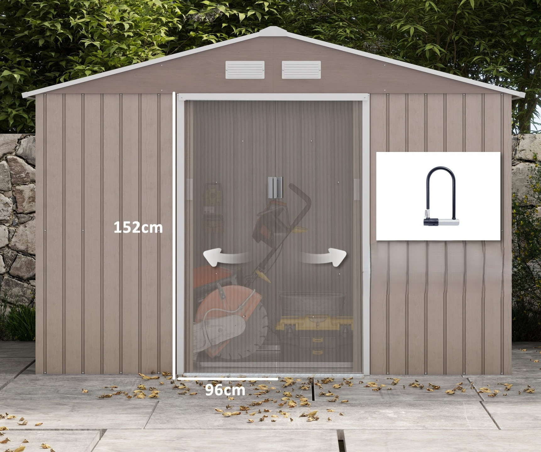 Ještě nemáte zahradní skříňku na zahradní náčiní? Pak je tento zahradní domek ideálním řešením! Přístřešek na kola je vyroben z pevné kovové konstrukce, která je robustní a odolná vůči povětrnostním vlivům. Dvoje posuvné dveře usnadňují přístup do zahradního domku, zatímco dvě okna v přední a zadní části zajišťují dostatek světla a příjemné větrání.