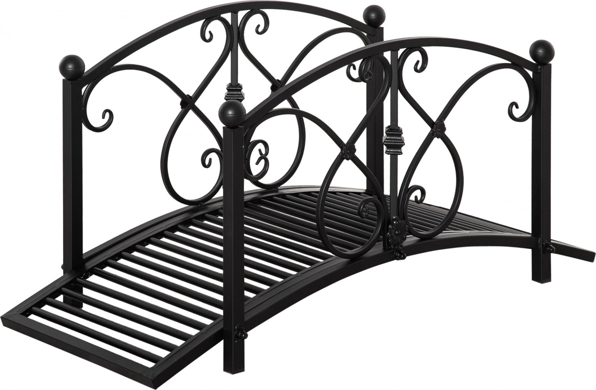 Zahradní můstek k jezírku ve vintage stylu má bezpečnostní zábradlí a dodá vašemu zahradnímu potoku, řece, rybníku nebo chodníku okouzlující starobylý vzhled. Starožitné černé květinové motivy a oblé tvary jako ústřední prvek vašeho krajinářského designu upoutají pozornost každého a dodají vaší zenové zahradě ten správný šmrnc. Design vaší zahrady nemusí být přeplácaný - spojte formu a funkci s touto fantastickou lávkou.