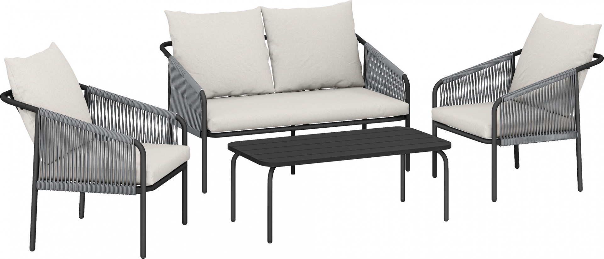 • Čtyřdílná souprava zahradního nábytku z proutěného ratanu, která se skládá z dvoumístné pohovky, dvou křesel a konferenčního stolku.