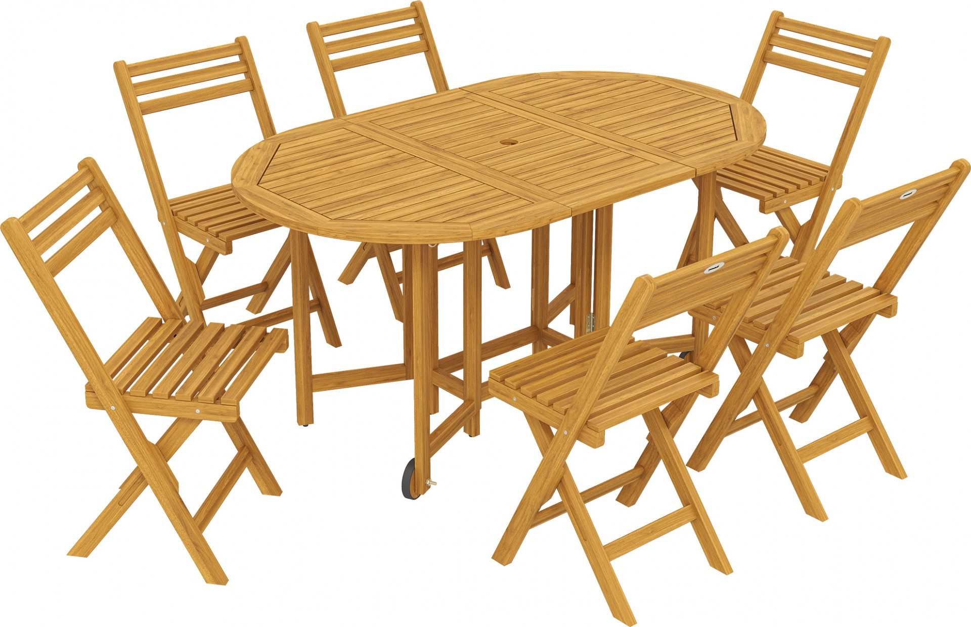 Deštivé týdny a nečekaný vítr mohou z venkovních jídel udělat rozvrzanou kaši a další židle se objeví právě ve chvíli, kdy jsou zbytečné. Dřevěná sada zahradního nábytku z akáciového dřeva s certifikátem FSC nabízí robustní pohodlí odolné proti povětrnostním vlivům, prostor pro šest osob se stolem a šesti židlemi a praktickou funkci skládání: každá židle v jídelní sadě se vejde pod desku stolu, takže vaše terasa zůstane volná, když se změní plány.