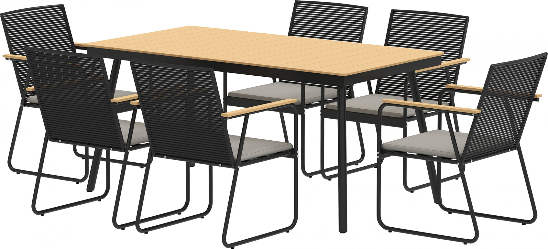 Proměňte svůj venkovní prostor s elegantním zahradním stolem a židlemi pro 6 osob! Každá židle v sadě zahradního nábytku nabízí dlouhotrvající pohodlí při sezení díky měkkému čalouněnému polštáři. Robustní deska stolu z dřevoplastového kompozitu vzdoruje povětrnostním vlivům a slibuje dlouhotrvající kvalitu. Tato sada zahradního nábytku, která je ideální pro stolování pod širým nebem, v sobě spojuje pohodlí, funkčnost a stylovou modernost, díky čemuž bude každé venkovní jídlo výjimečné.