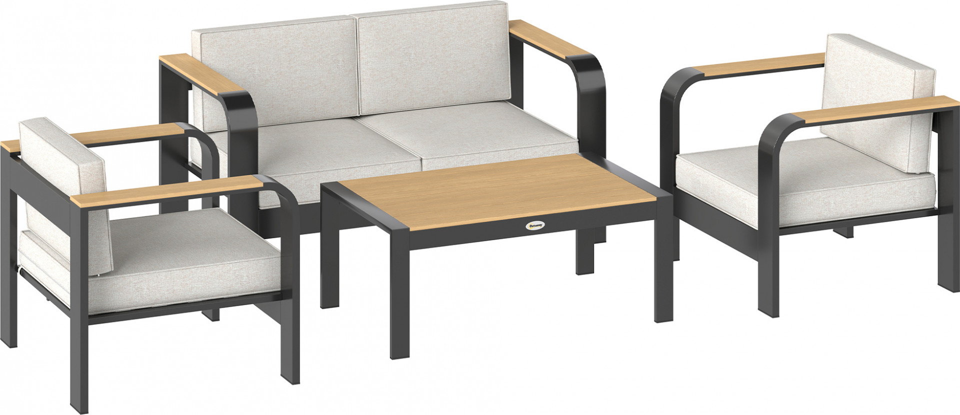 - Čtyřdílná modulární sada zahradního nábytku: jeden dvousedák, dvě křesla a konferenční stolek.