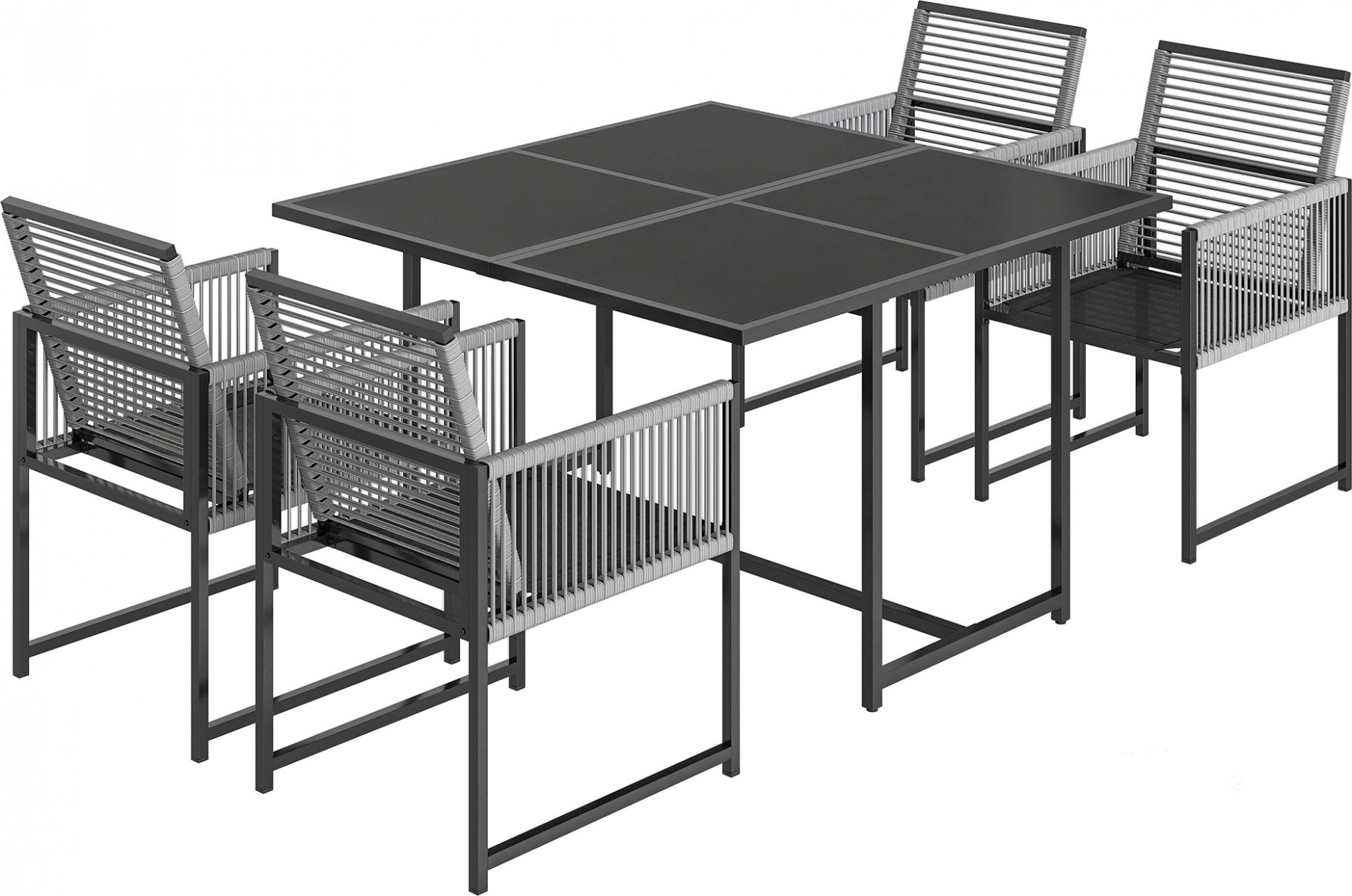 • Pětidílný venkovní jídelní set: jeden stůl a čtyři židle k sezení.