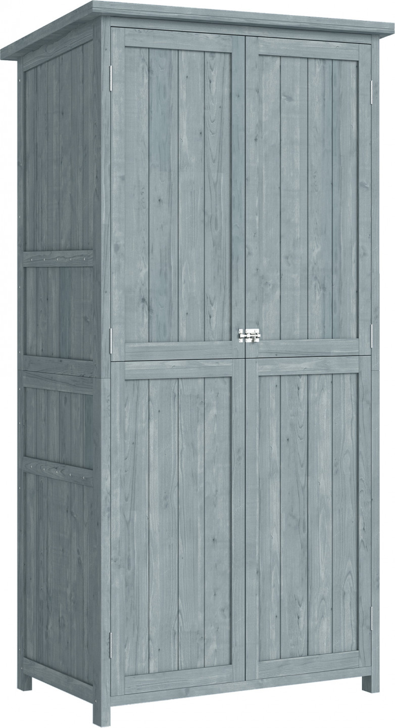 - Dvojité dveře s kovovými západkami pro větší bezpečnost této zahradní skříně