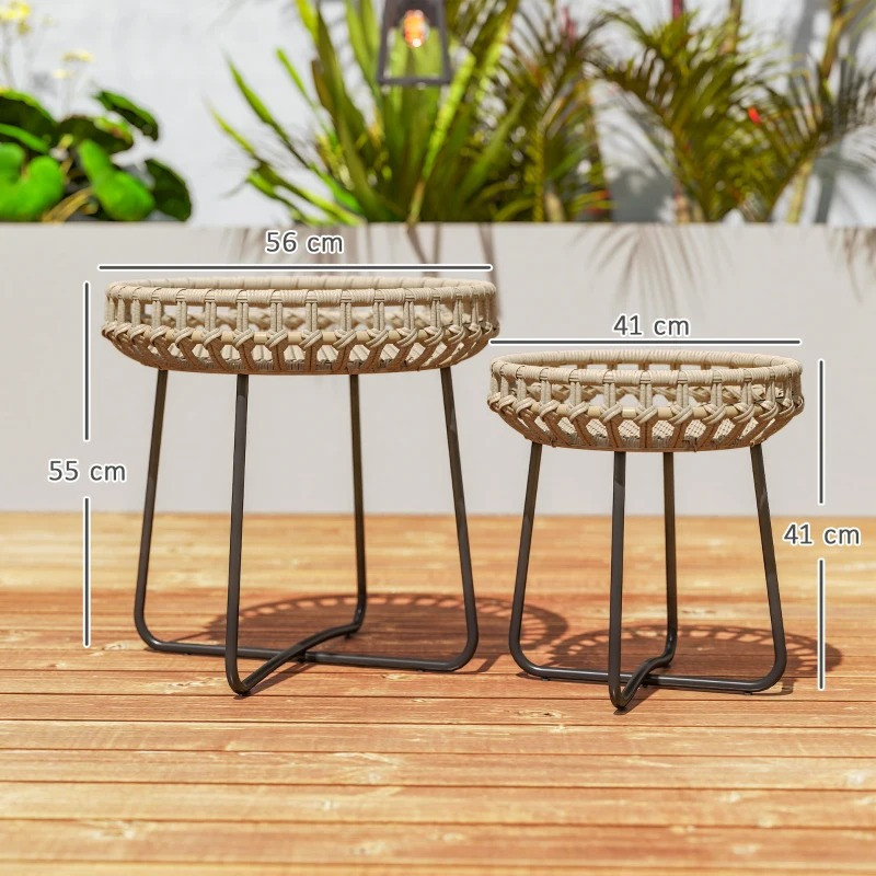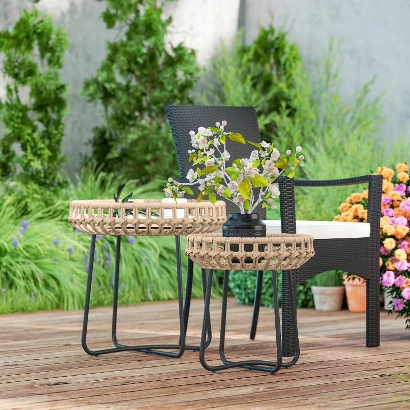 Poznejte eleganci malých ratanových stolků, které jsou praktické i stylové. Tyto kulaté ratanové stolky jsou ideální pro vaše potřeby, ať už je umístíte dohromady a vytvoříte tak moderní vrstvený vzhled, nebo jednotlivě. Elegantní černá ocelová základna a ratanový potah odolný proti povětrnostním vlivům vytvářejí stylový celek, který zaujme v interiéru i exteriéru.