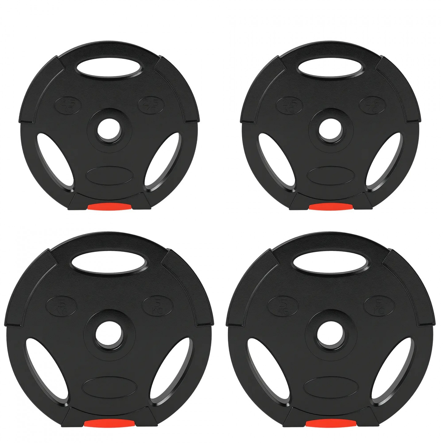 Doplňte svou domácí posilovnu o zátěžové desky, včetně dvou 5kg a dvou 2,5kg zátěžových desek, které jsou vhodné pro jakoukoli standardní 2,5cm činkovou tyč. Díky třem ergonomickým úchytům umožňují zátěžové kotouče všestranné cvičení i bez tyče. Polypropylenová ochrana navíc chrání vaši podlahu před poškozením. Ideální pro zvýšení flexibility vašeho fitness programu.